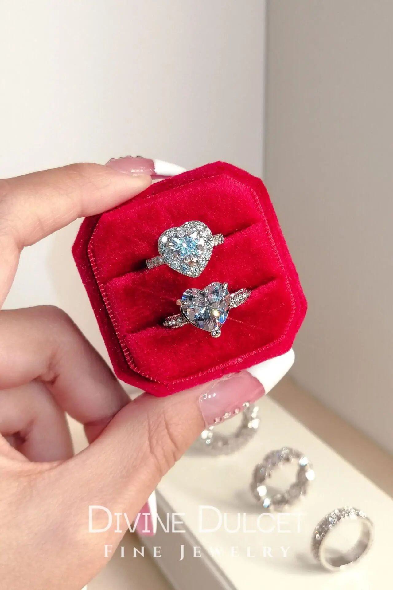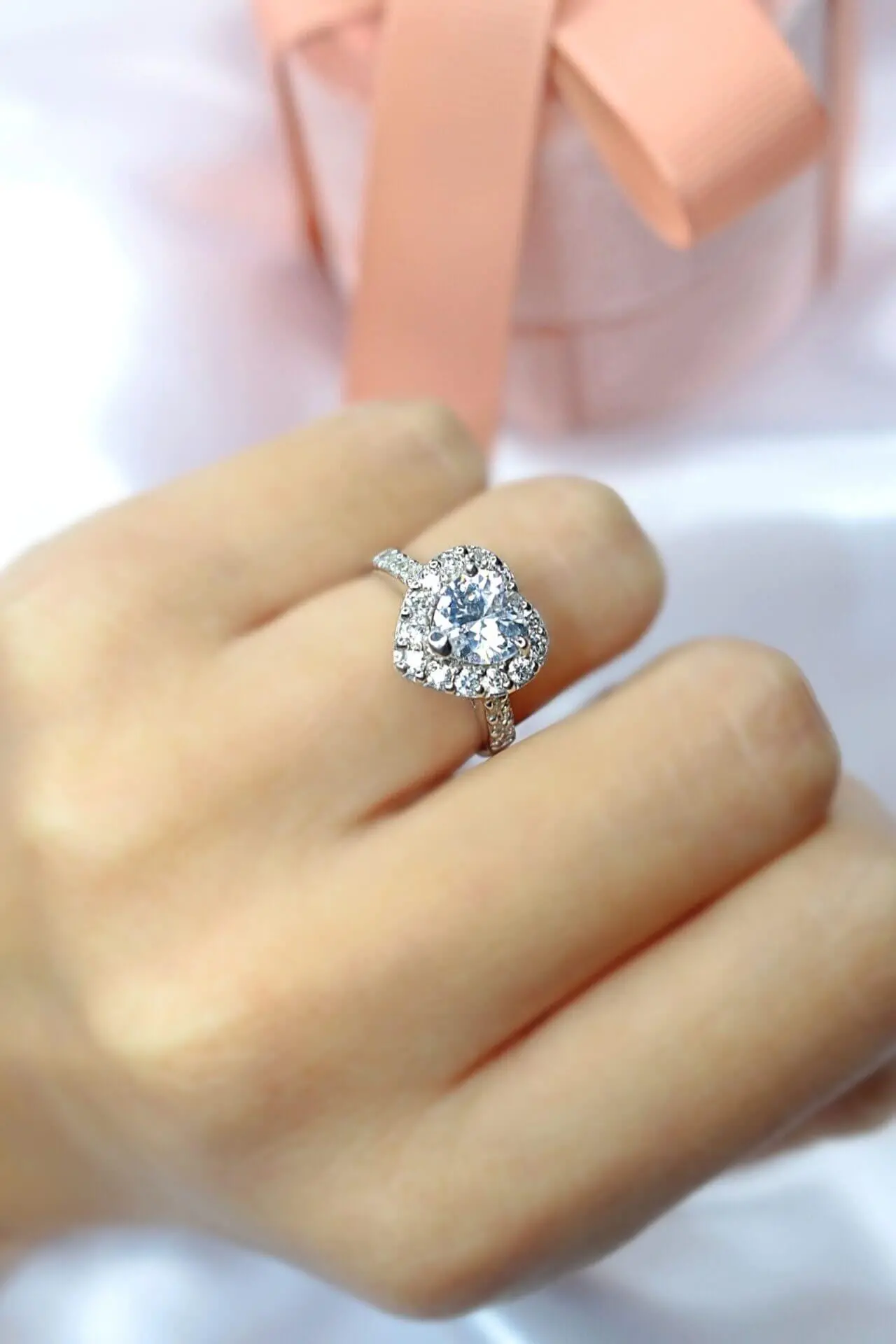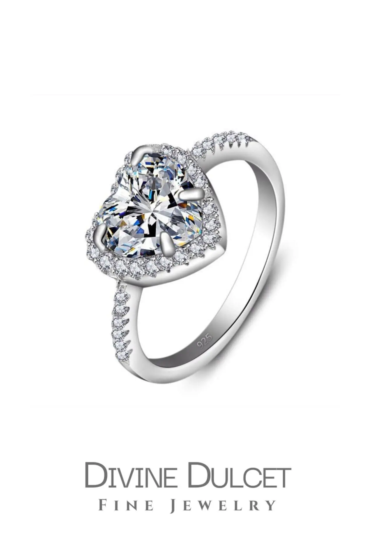This silver heart ring is made of 18 karat white gold plated 925 sterling silver and diamond cut cubic zirconia inlays that form a halo heart that generates beautiful sparkles against light.