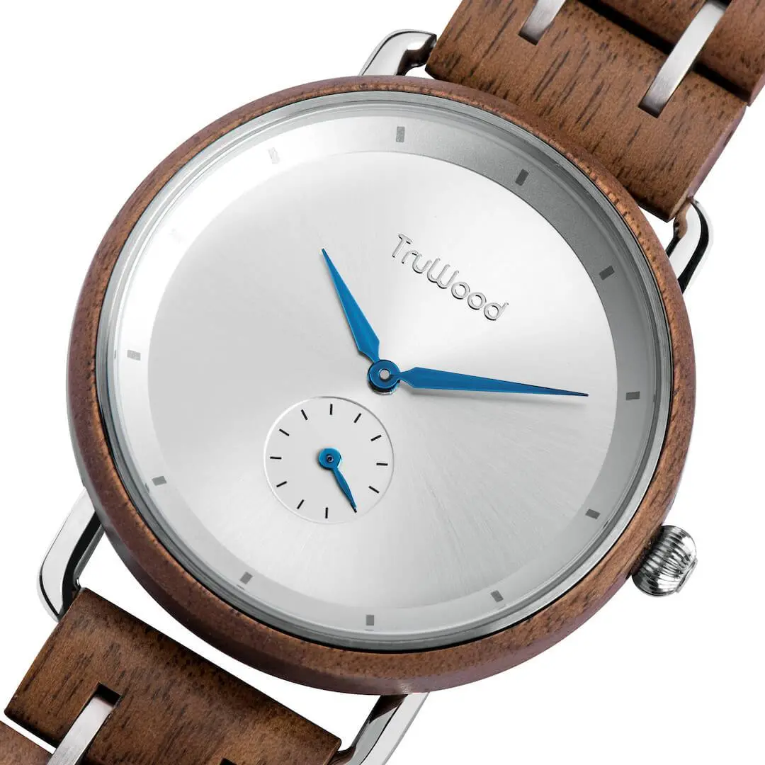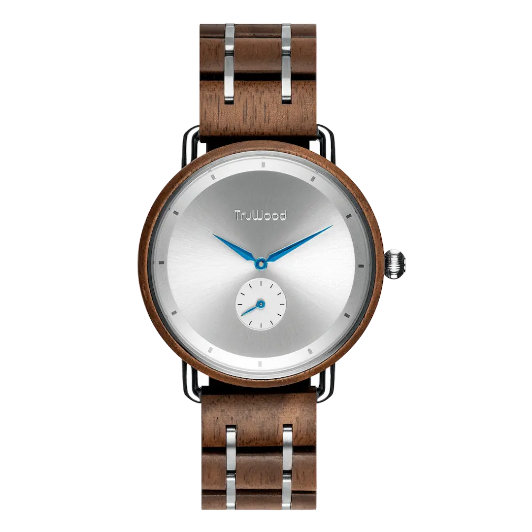 Minimal yet undeniably sophisticated, the TruWood Dune is the true Gentlemans watch choice. Thecolour pairings in the brown walnut wood and metal are specifically chosen to compliment each other and stand out as a match made in heaven. Featuring a clean silver dial with metallic blue accent hands, theDune uses a combination of plated silver stainless steel lugs and brown wood band links to create a timepiece that will stand the test of time. With its perfectly aligned inner sub dial, precision in modern craftsmanship has and will never look as distinguished as this.