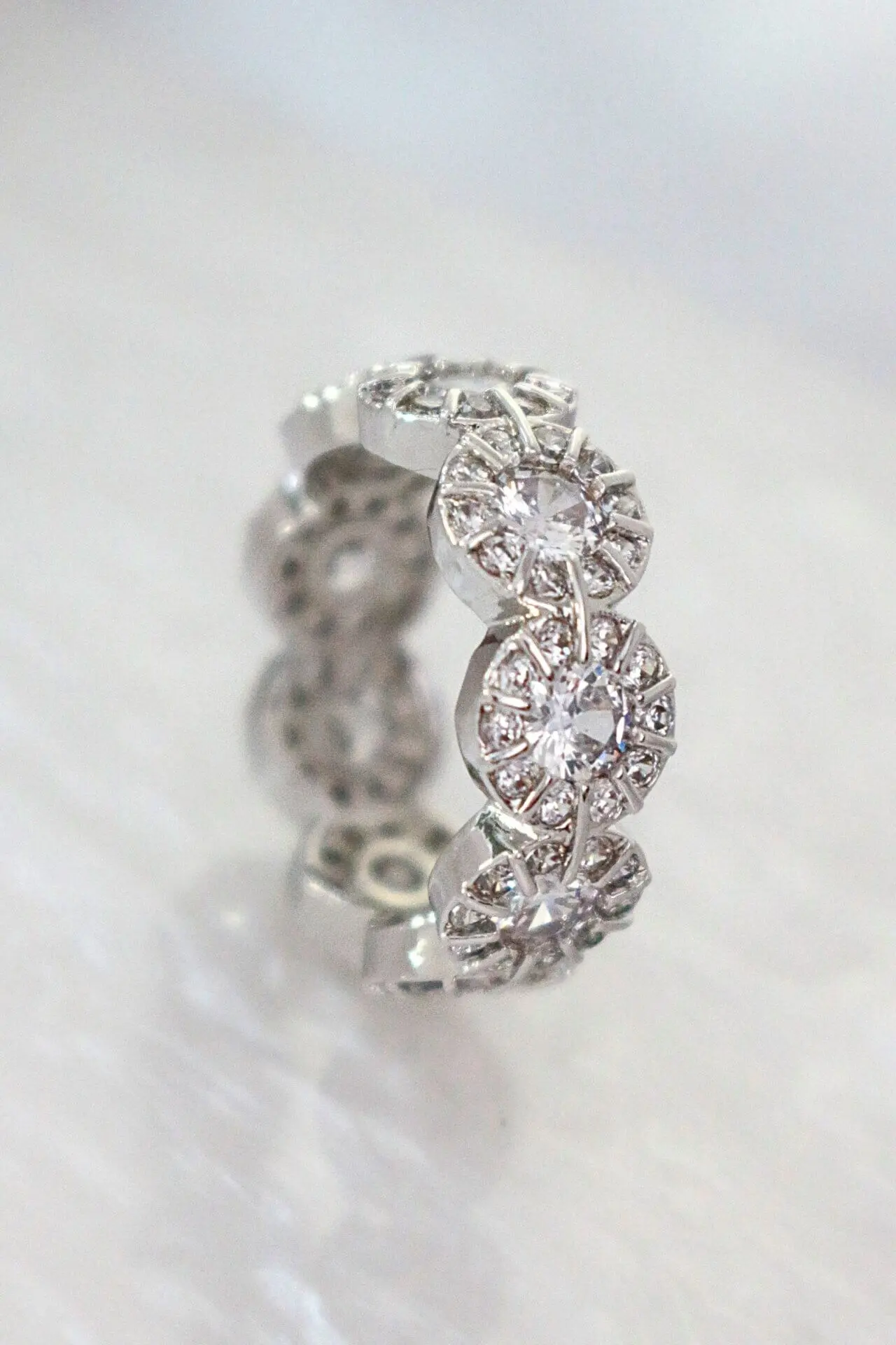 This silver band ring is made of sterling silver and 18 karat white gold plated and inlaid with colorless cubic zirconia, these beautiful zirconia stones create beautiful sparkles against light and a wonderful effect as the entire ring is inlaid with these shiny stones.