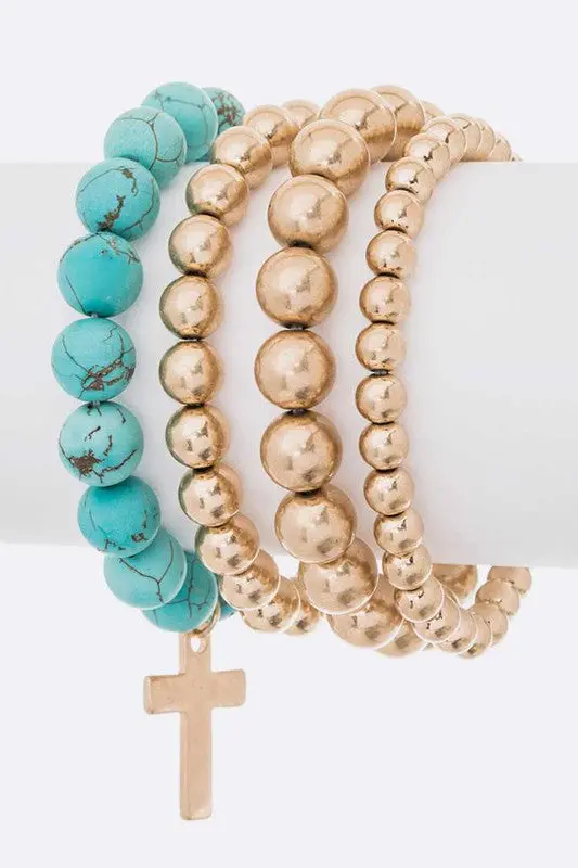 Layered Beads Cross Charm Bracelet Set
