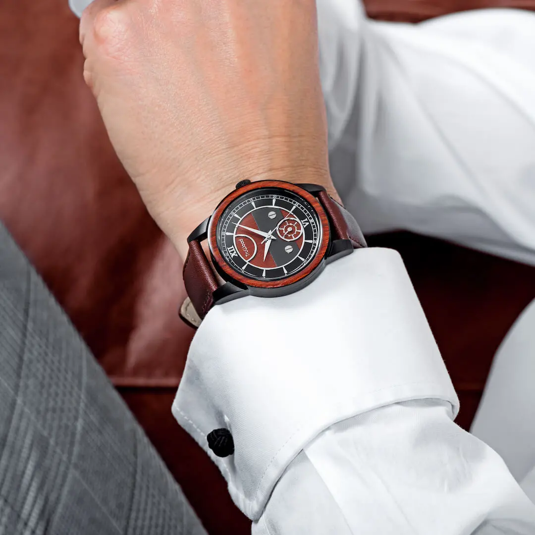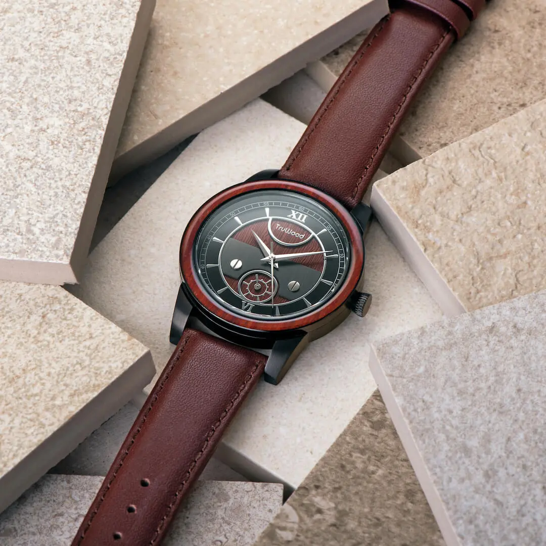 The TruWood Napoleon watch is a paradigm shift. Inspired by the human drive to explore in mind, this collection serves as a reminder to discover and achieve the unattainable. Each Napoleon timepiece is crafted with hand-picked black and red sandalwood, masterfully designed after the ships that have traversed our oceans. The genuine brown leather band is held together by black stainless steel lugs and clasp, topped with a redwood bezel reminiscent of history’s greatest explorers. This watch rests lightly on your wrist, sporting a subtle sub dial so you can look your best when delving into uncharted territory.