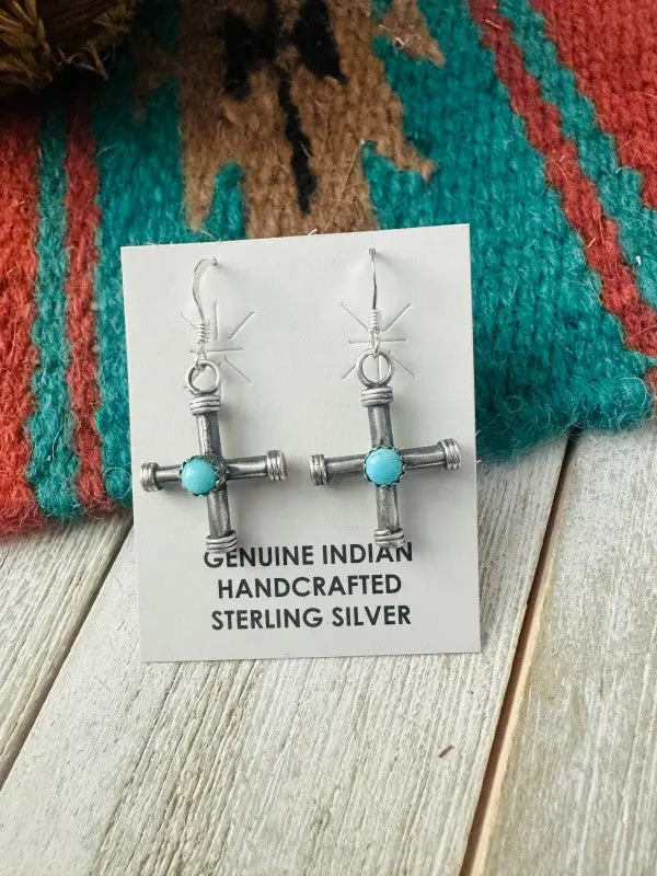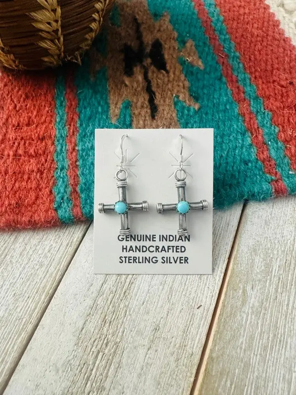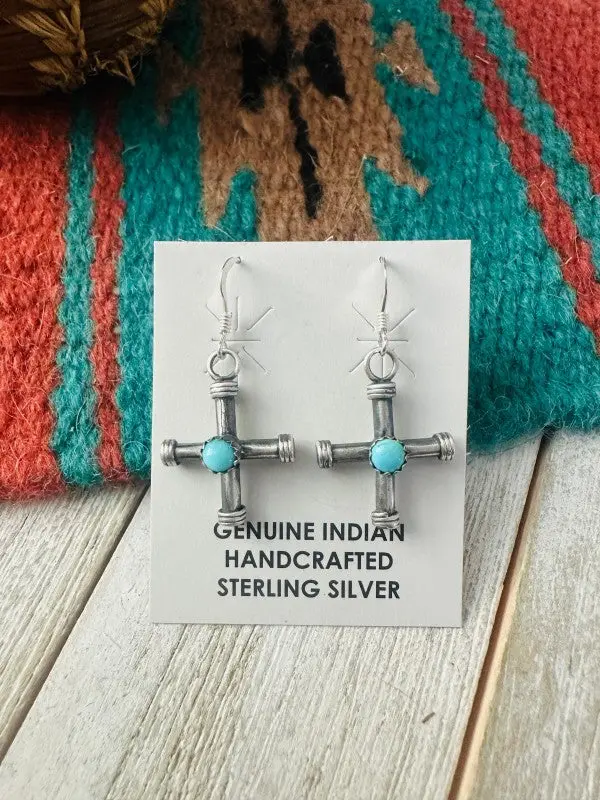 Beautiful Navajo Turquoise andSterling Silver Cross DangleEarrings. Measuring 1 3/8 inches long and 1 3/4inches wide. Stamped Sterling. Such a prettypair!