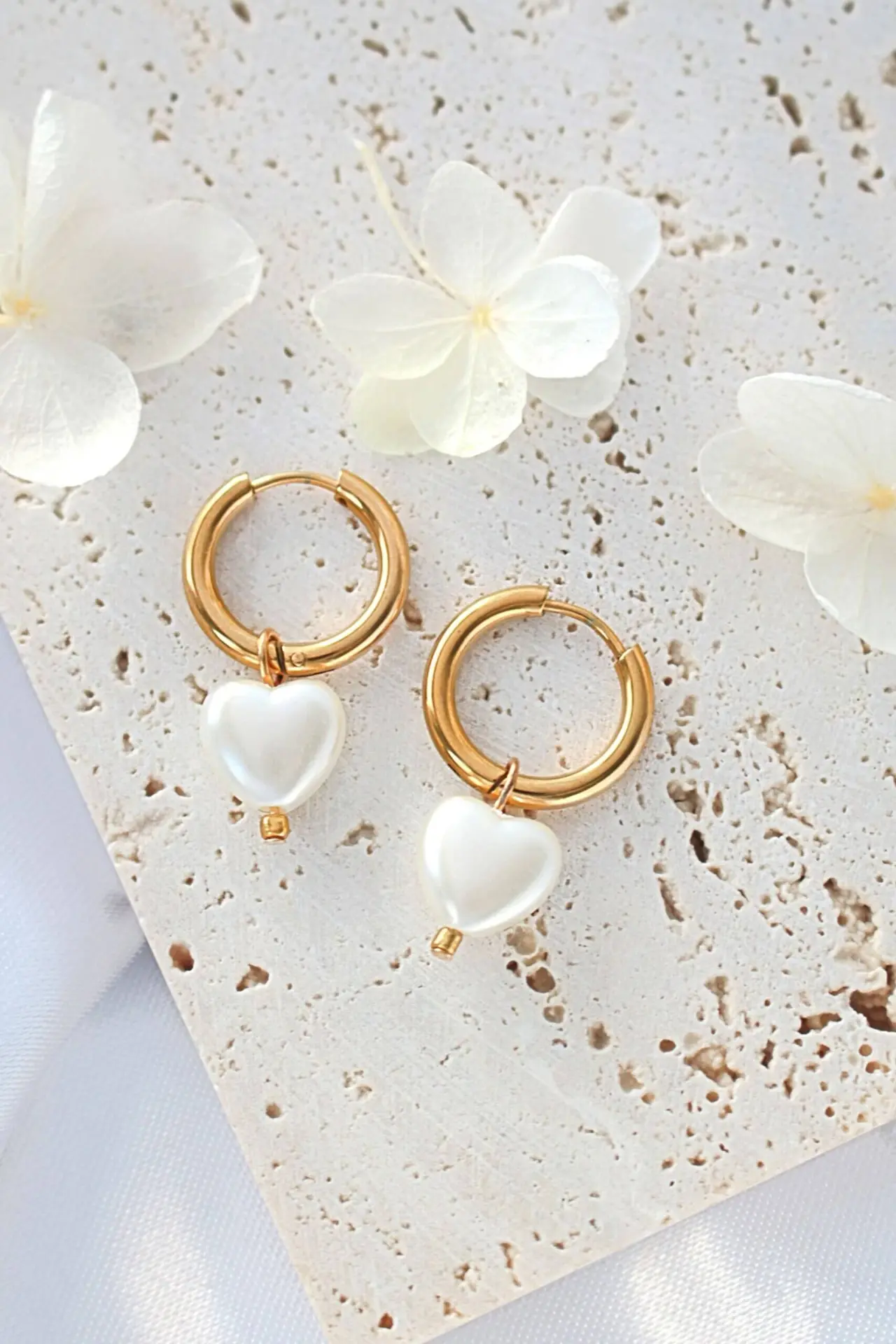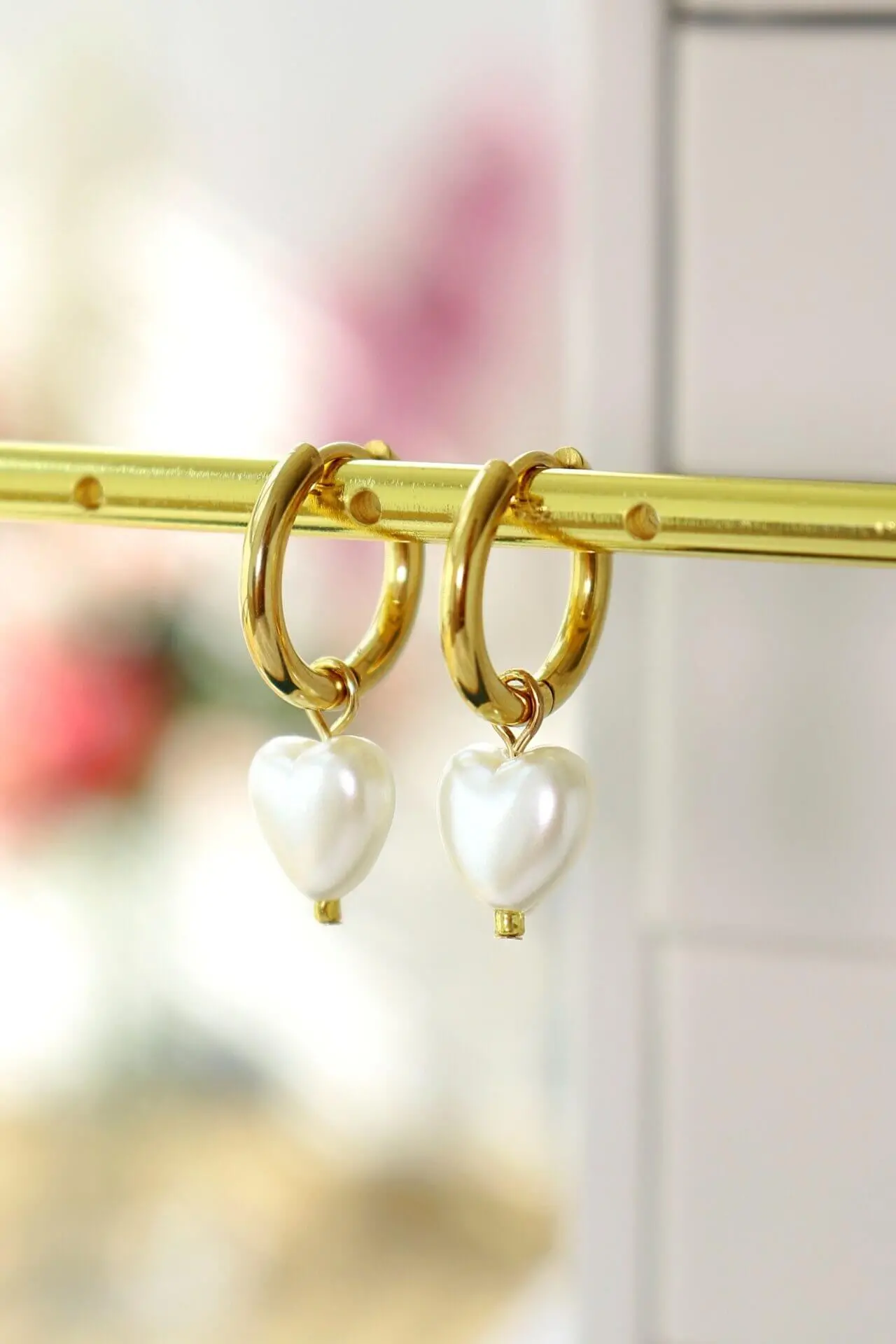 Cute heart hoop earrings made of 18 karat gold plated stainless steel and acrylic pearls in heart shape.