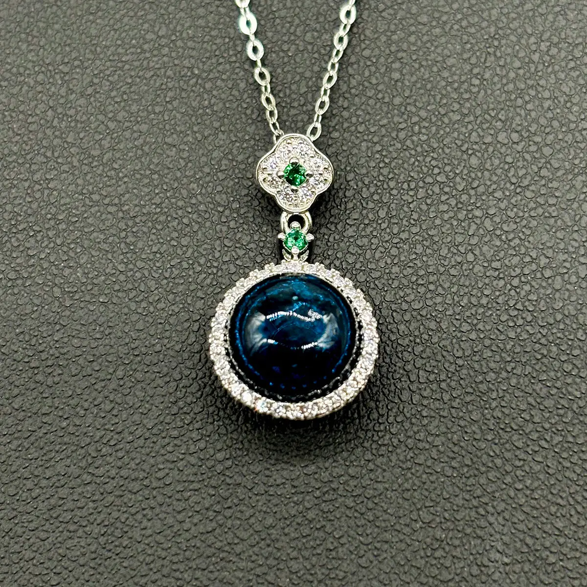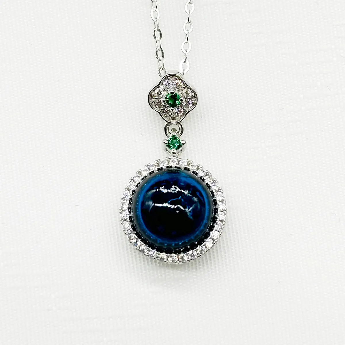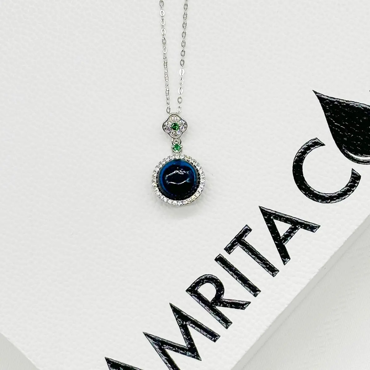Elevate your style with our stunning new Crown Jewel Aroma Necklace with navy ball, a harmonious blend of exquisite design and timeless aroma. Crafted with care, the pendant and chain gleam are purely sterling silver (925 silver) adorned with beautiful white and green cubic zirconia stones, while the Murano glass pieces are meticulously hand-blown.
