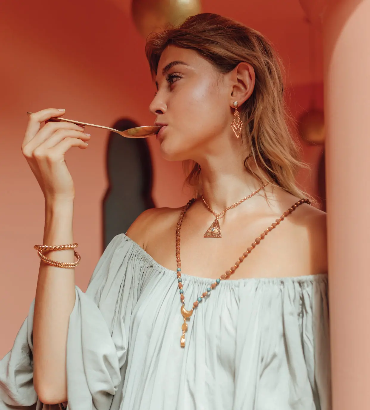 All INDAH gems, including the CHANDRA MALA Necklace, are designed by Coco Effendi and carefully dipped in 24k gold or enhanced with silver, depending on your preference. Each piece is thoughtfully crafted to bring confidence and empowerment by awakening the goddess within.
