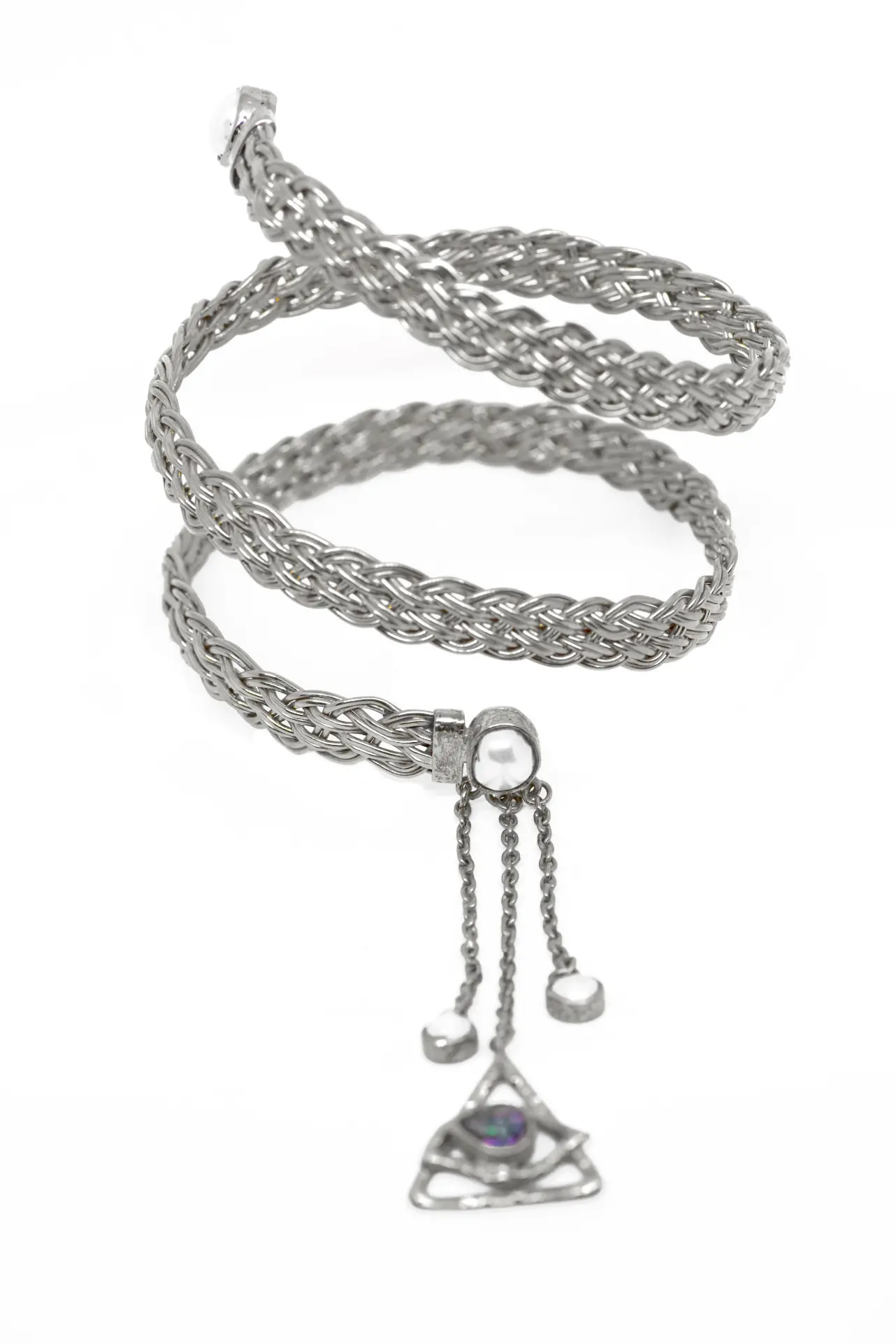 Experience the enchantment of our meticulously handcrafted braided arm band. Made with exquisite pearl and mystic topaz, this arm band embodies purity and vitality, while igniting your spiritual connection with the cosmos.
