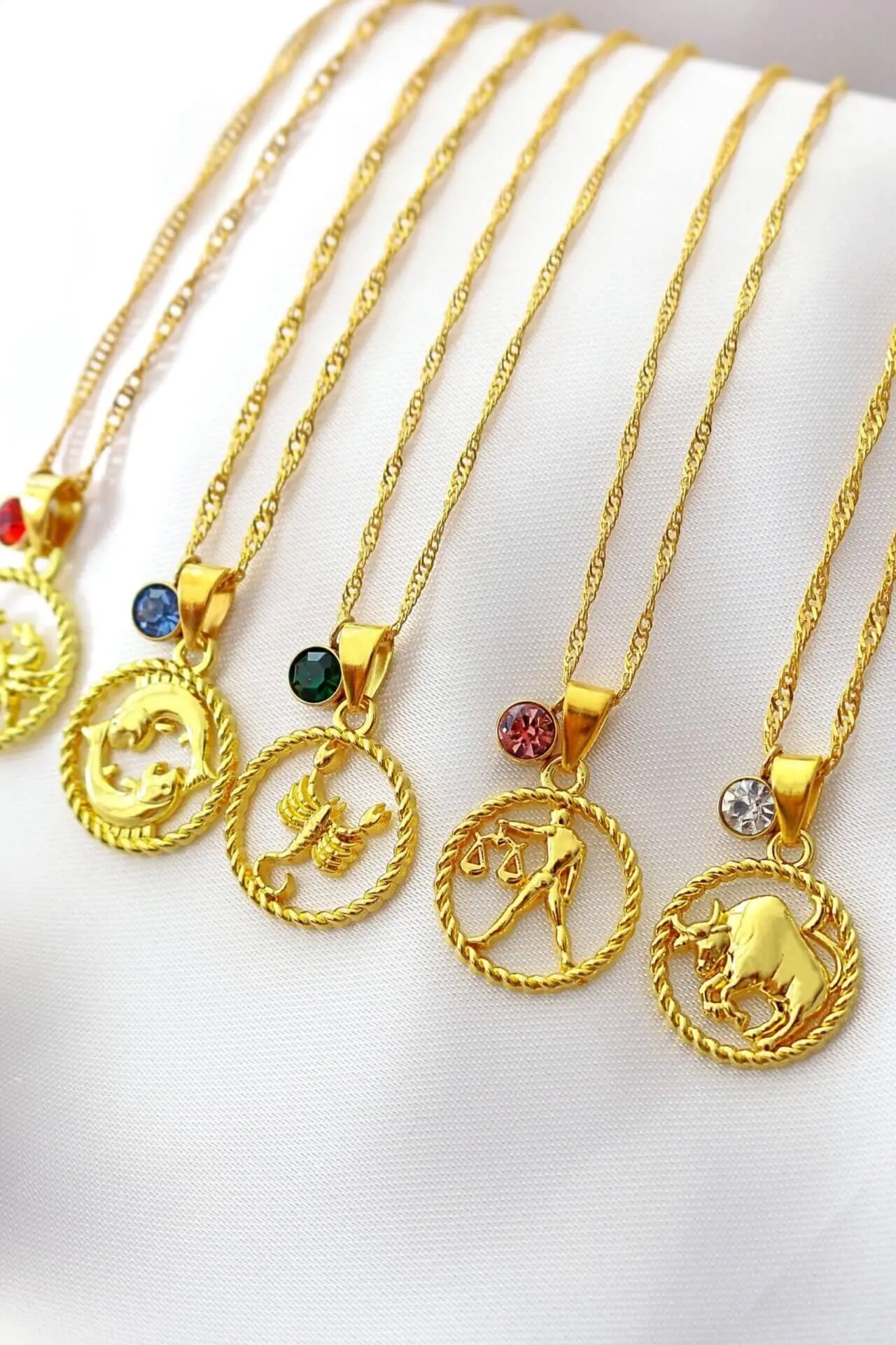 This unique zodiac necklace is made of 18 karat yellow gold plated copper with cubic zirconia inlaid on the birthstone charm (Aries, Taurus, Gemini, Cancer, Leo, Virgo, Libra, Scorpio, Sagittarius, Capricorn Aquarius and Pisces).